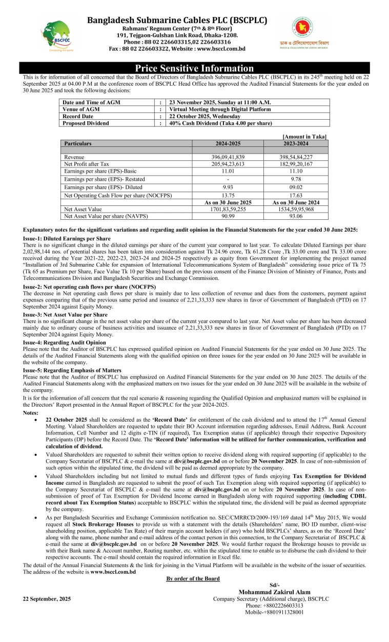 Price Sensitive Information of Bangladesh Submarine Cables PLC.