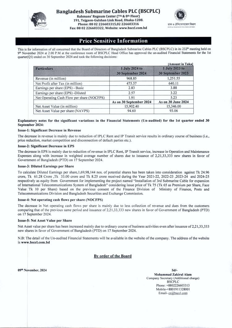 Price Sensitive Information of Bangladesh Submarine Cable Company Limited(BSCCL)