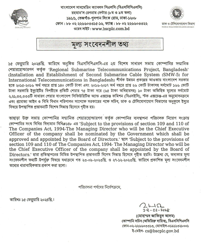 Price Sensitive Information of Bangladesh Submarine Cable Company Limited(BSCCL)