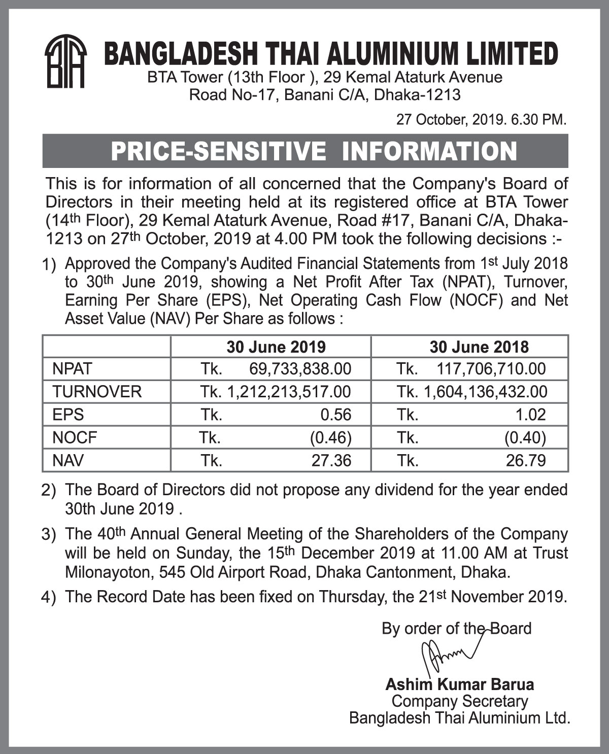 Price Sensitive Information of Bangladesh Thai Aluminium