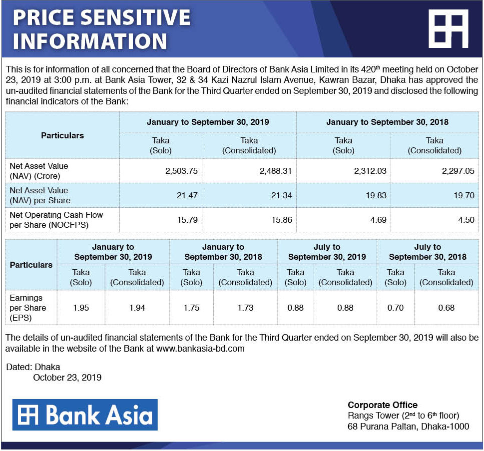 Price Sensitive Information of Bank Asia Limited