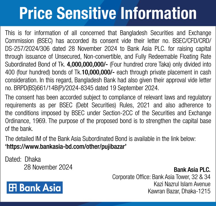 Price Sensitive Information of Bank Asia PLC