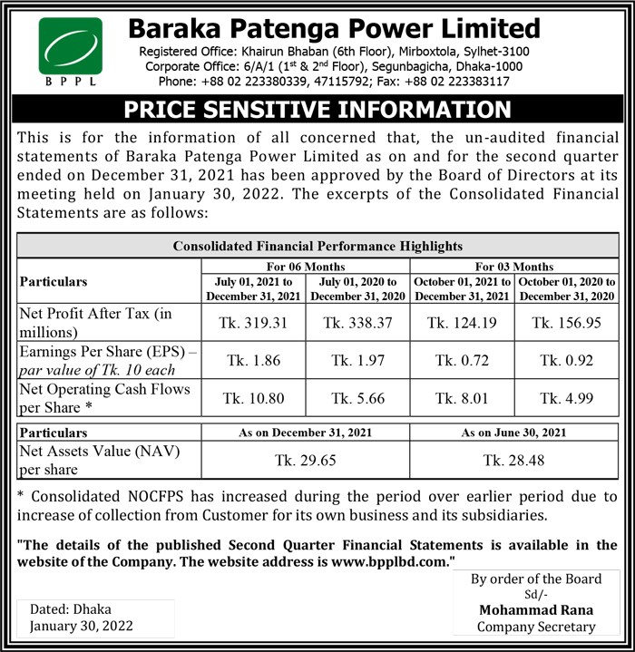 Price Sensitive Information of Baraka Patenga Power Limited