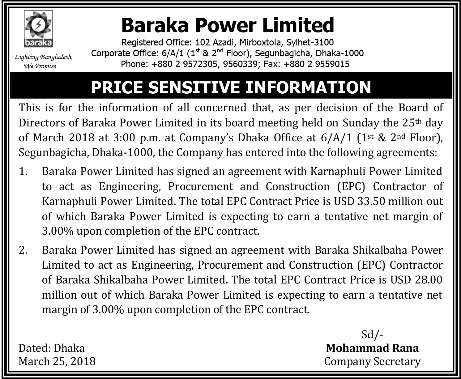 Notice to the Shareholders/Investors of Baraka Power Limited