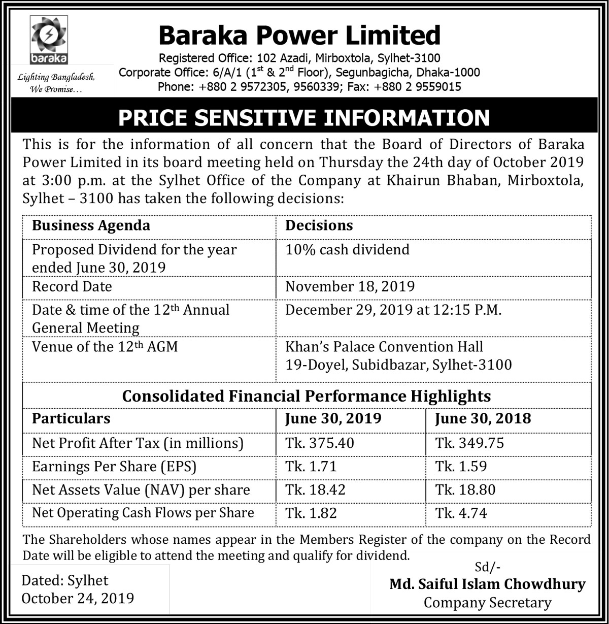 Price Sensitive Information of Baraka Power Limited