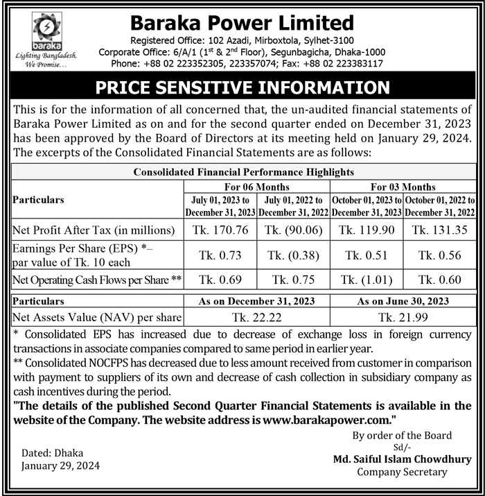 Price Sensitive Information of Baraka Power Limited