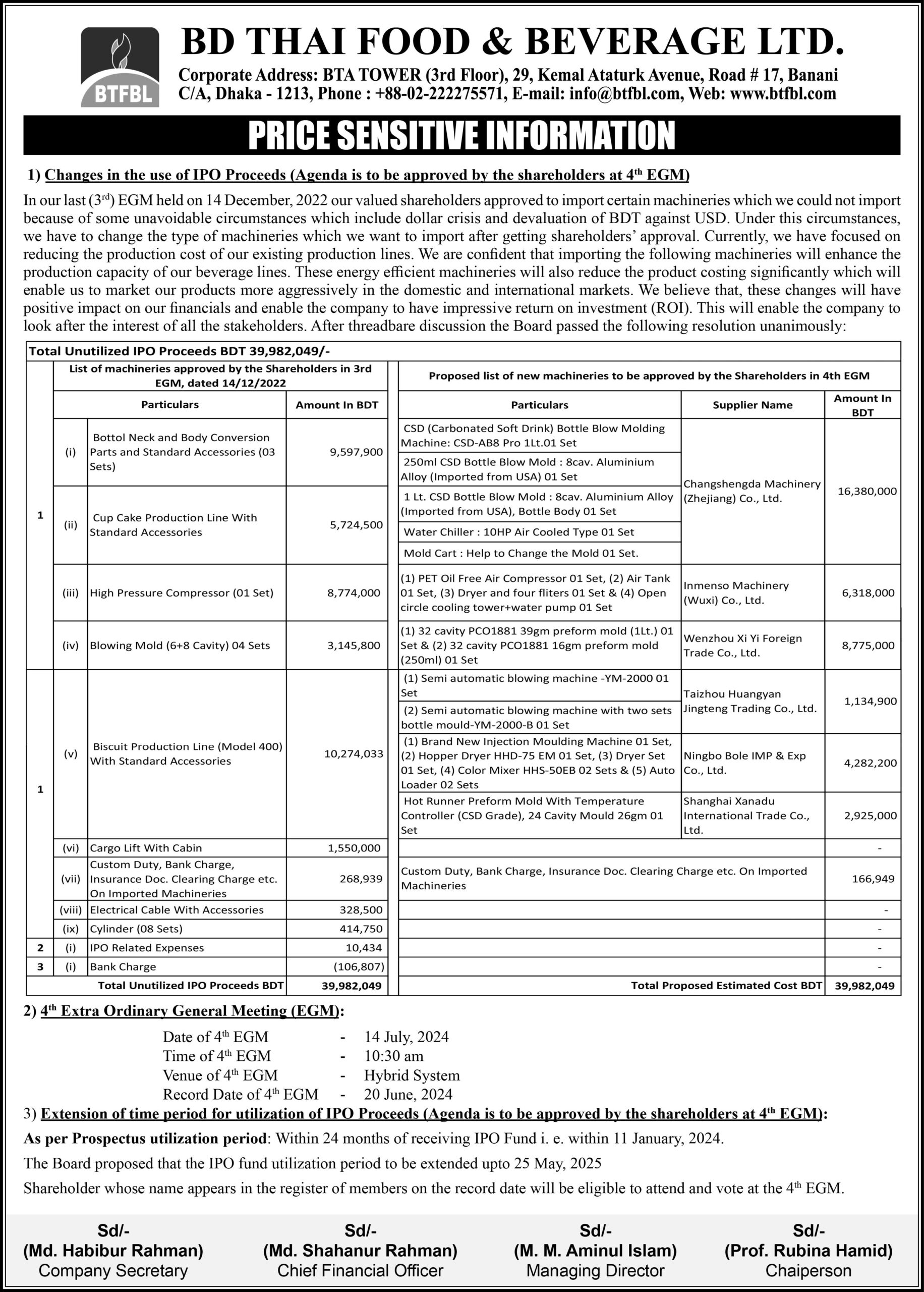 Price Sensitive Information of BD THAI FOOD & BEVERAGE LTD