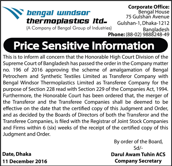 Price Sensitive Information of Bengal Windsor Thermoplastics PLC.