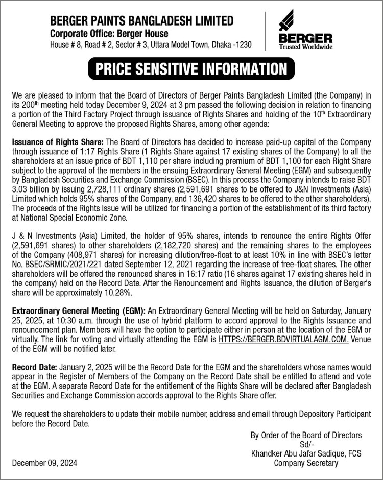 Price Sensitive Information of Berger Paints Bangladesh Limited