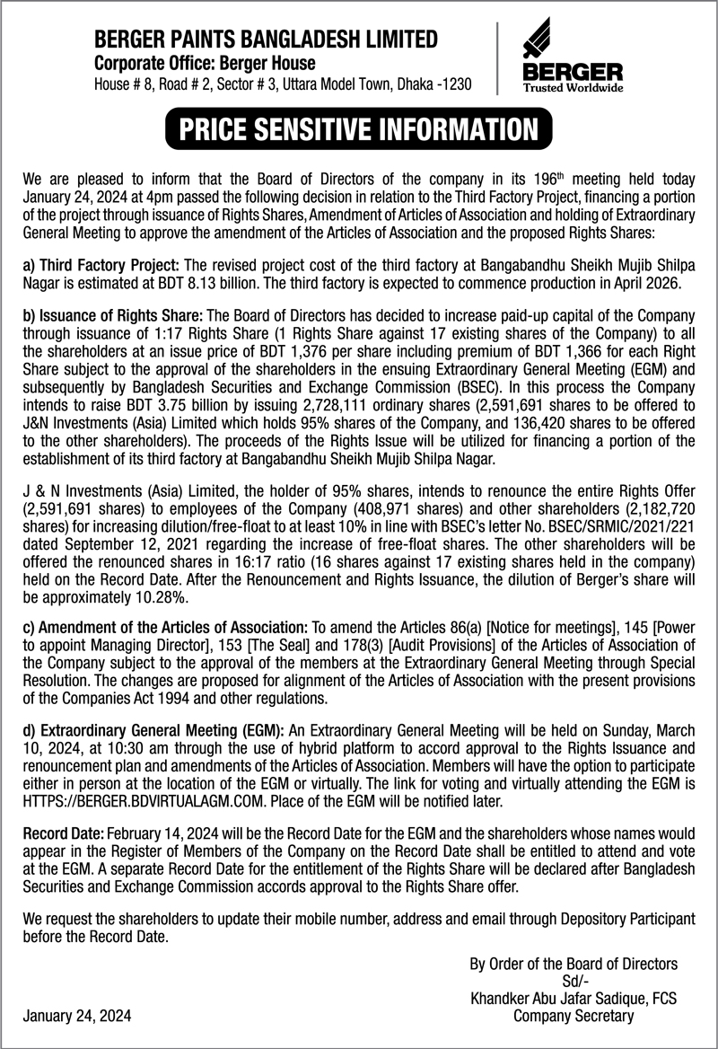 Price Sensitive Information of Berger Paints Bangladesh Ltd