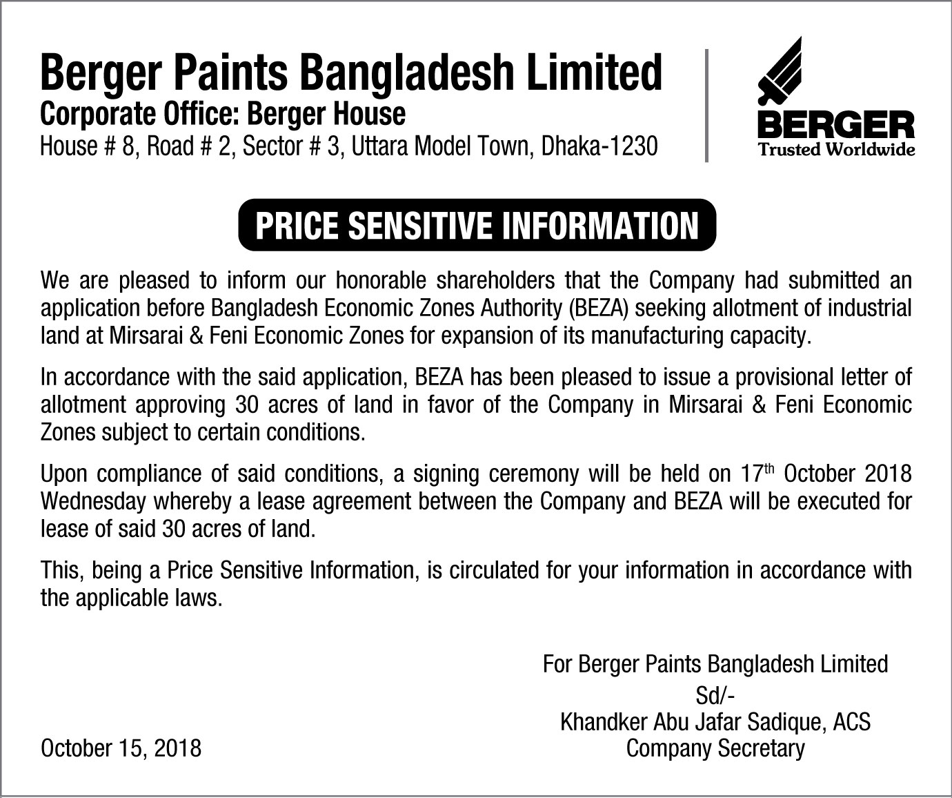 Price Sensitive Information of Berger Paints Bangladesh Ltd