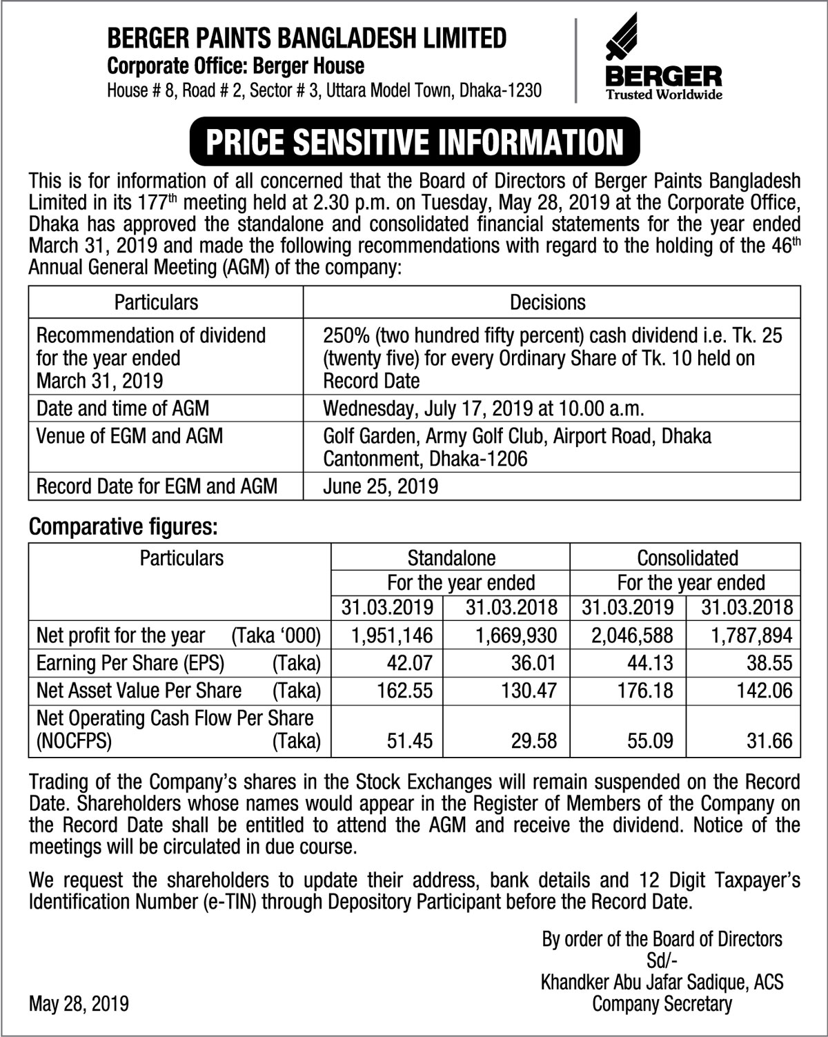 Price Sensitive Information of Berger Paints Bangladesh Ltd