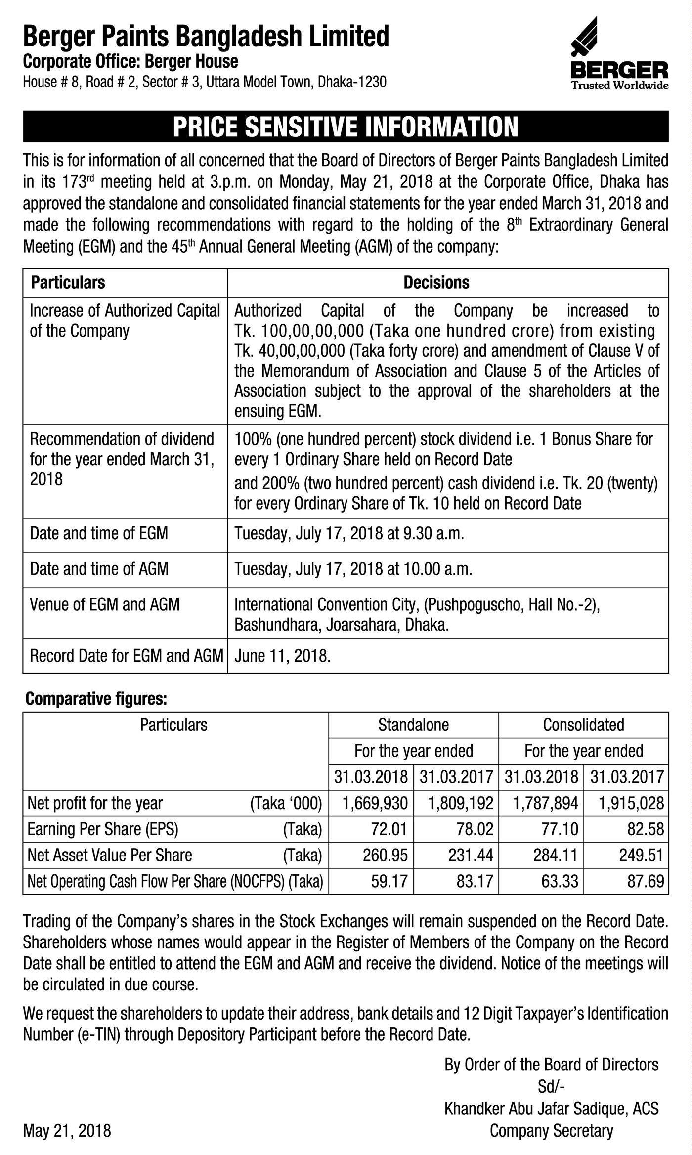 Price Sensitive Information of Berger Paints Bangladesh Ltd