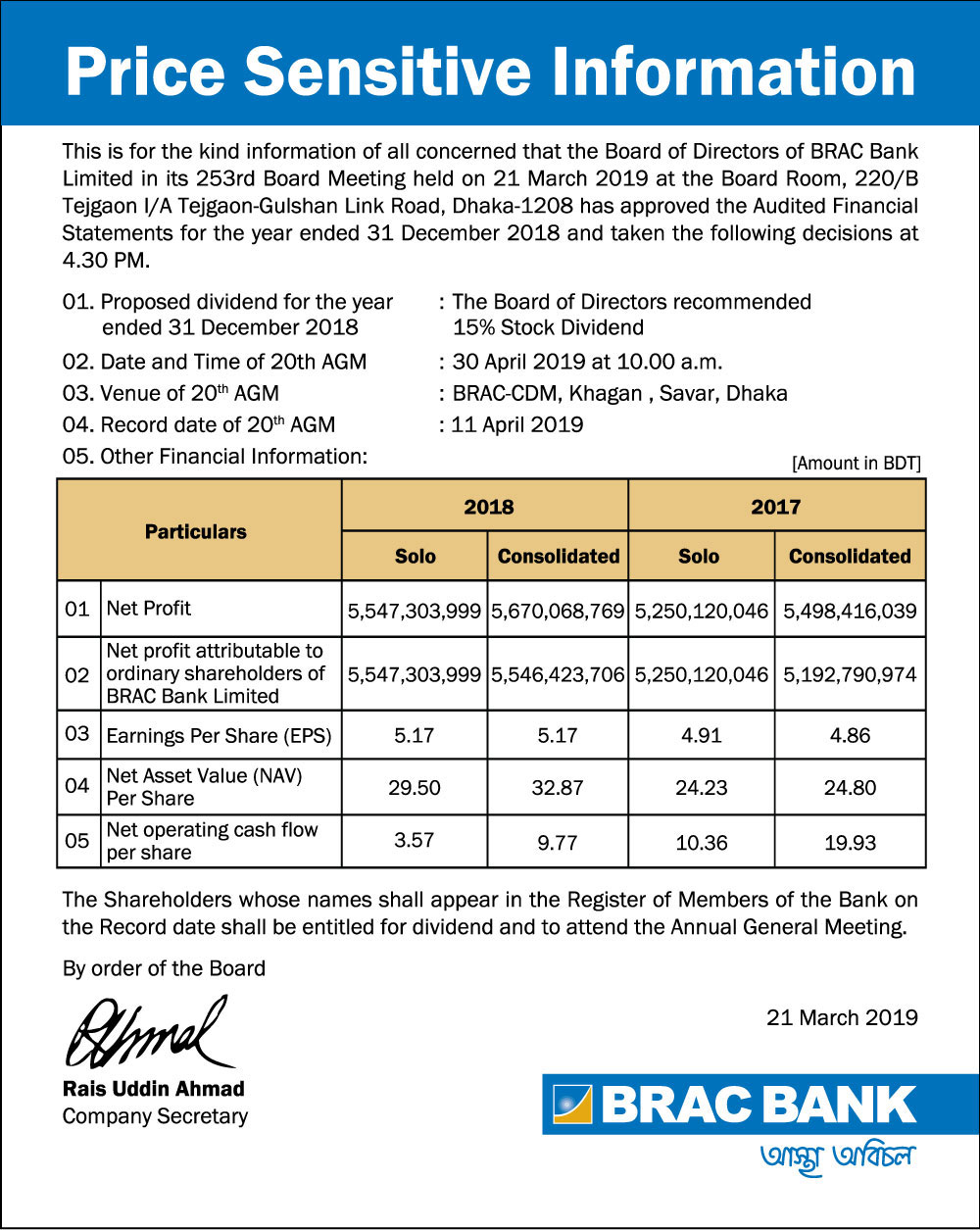 Price Sensitive Information (Q1) of BRAC Bank Limited