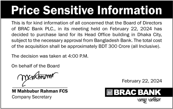 Price Sensitive Information of BRAC Bank Limited