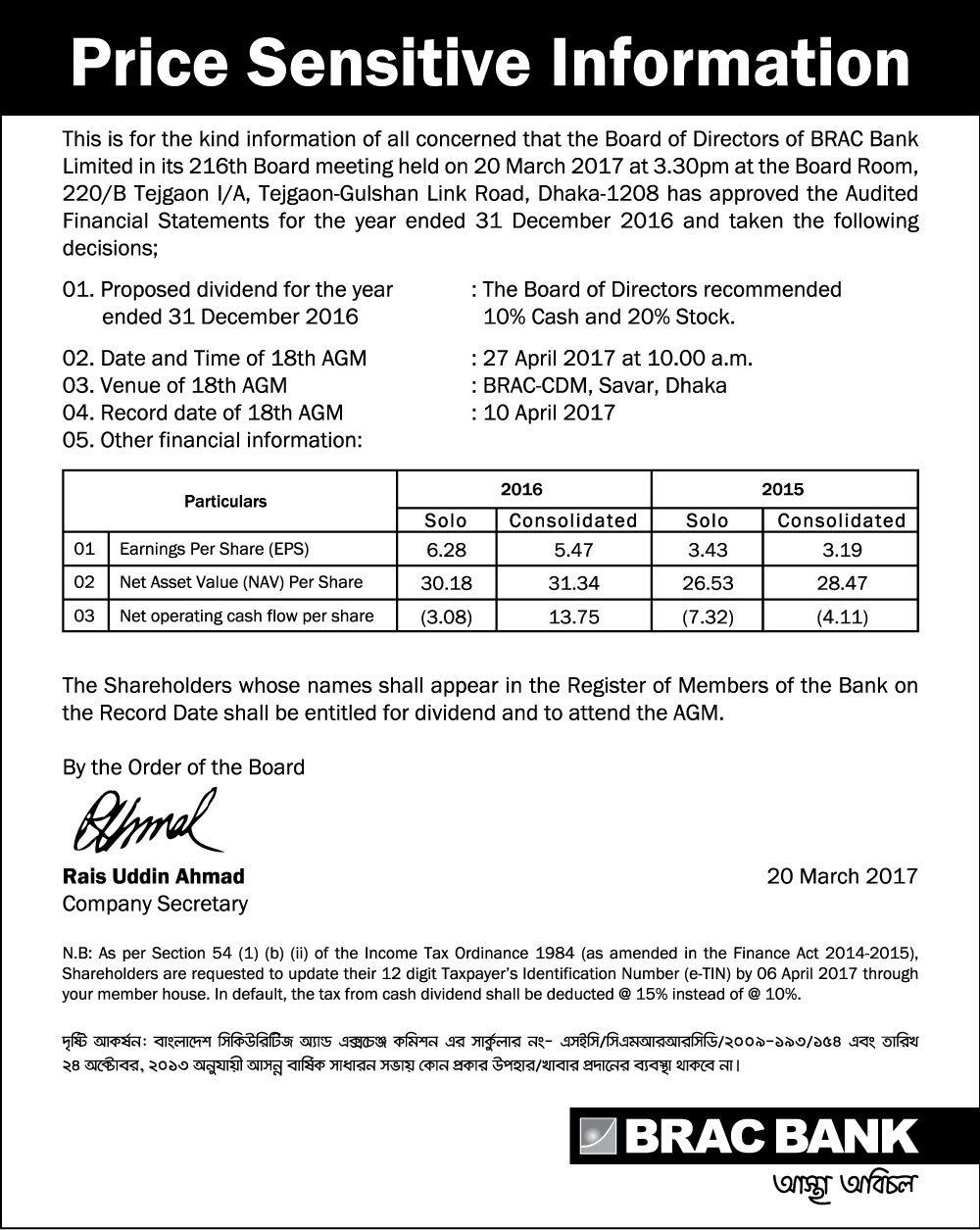 Price Sensitive Information of BRAC Bank Ltd.