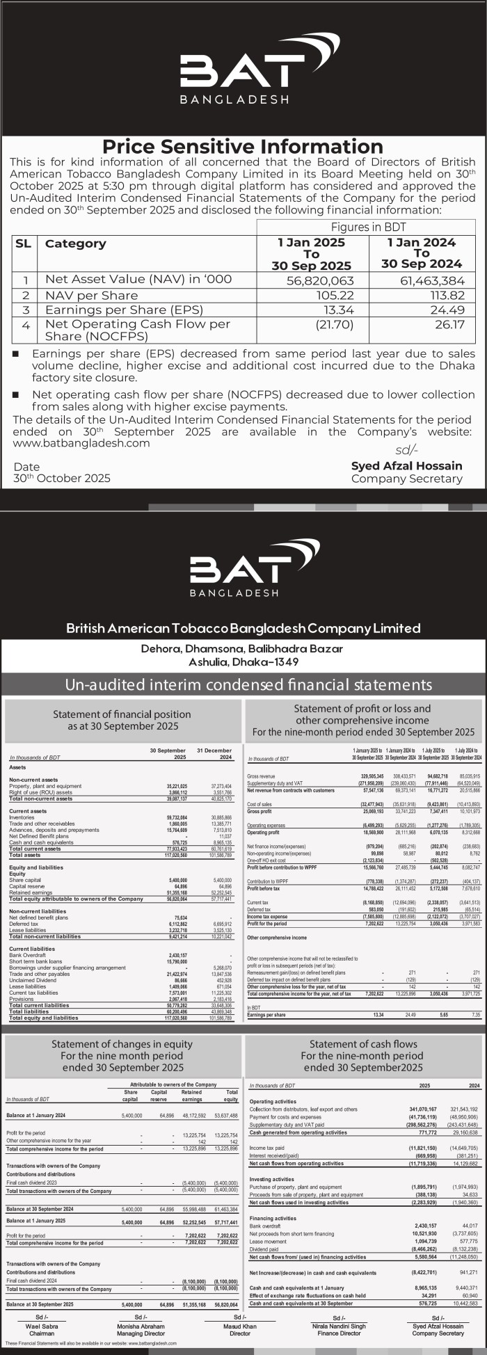 Price Sensitive Information of British American Tobacco Bangladesh Company Limited