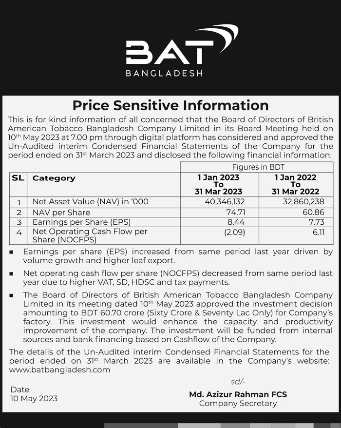 Price Sensitive Information of British American Tobacco Bangladesh Limited