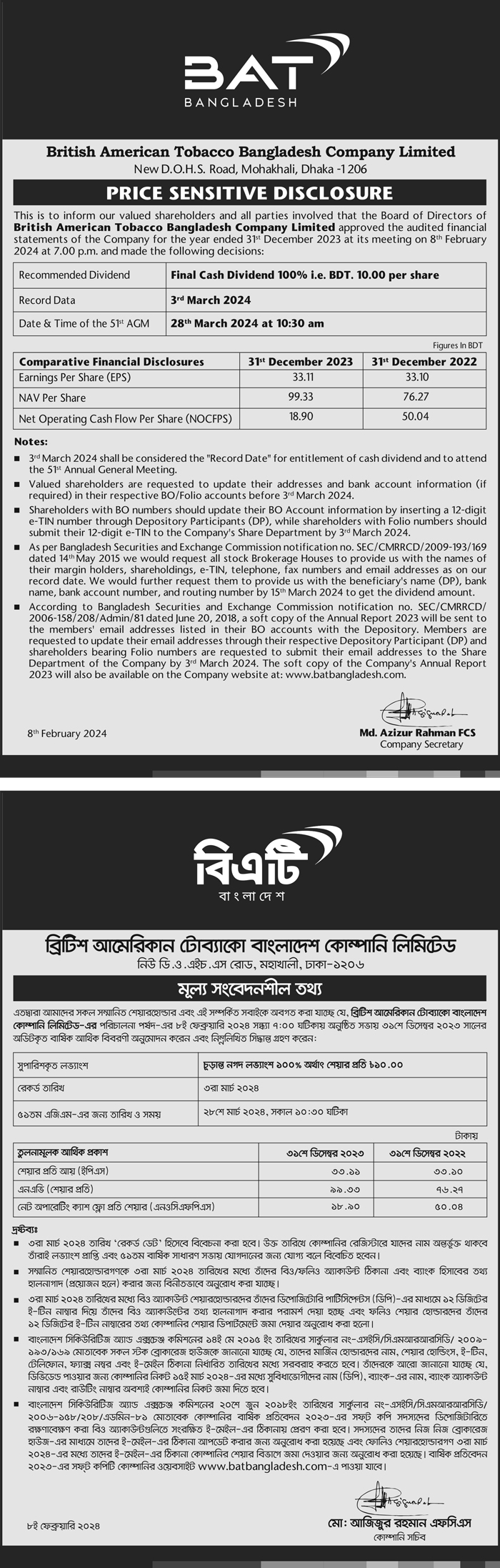 Price Sensitive Information of British American Tobacco Bangladesh Company Limited