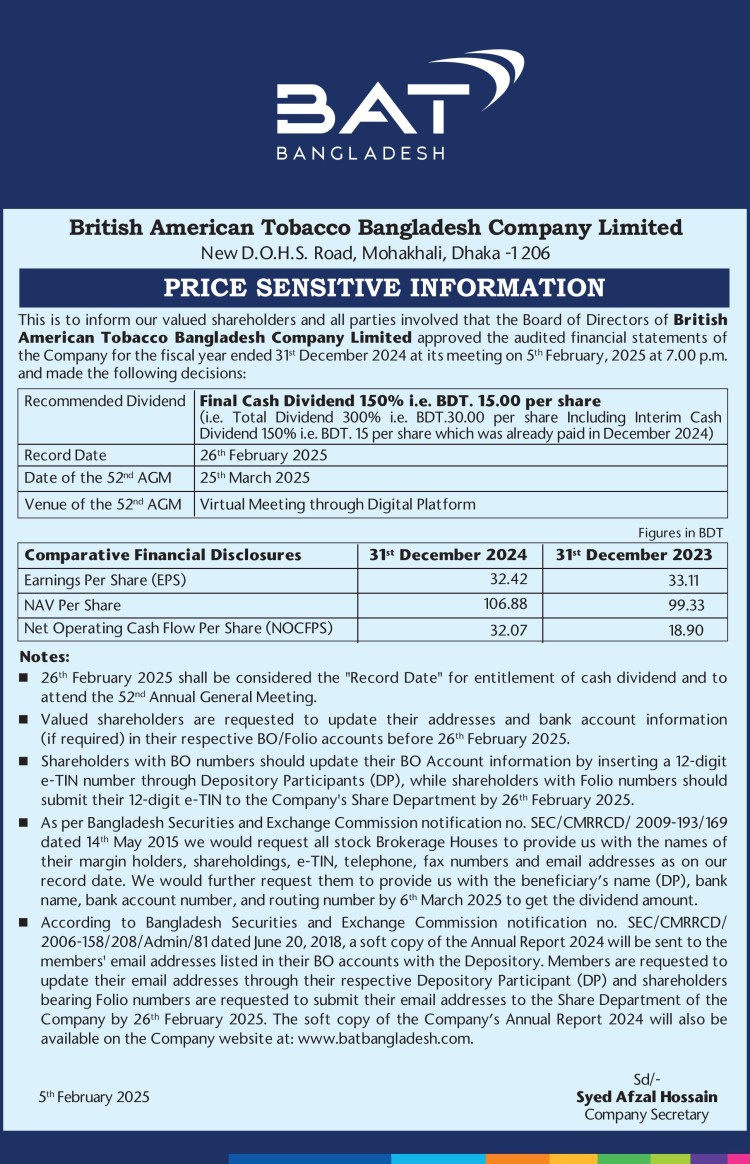 Price Sensitive Information of British American Tobacco bangladesh Company Limited