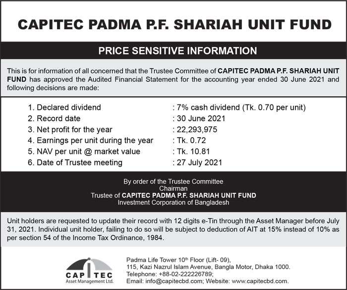 Price Sensitive Information of Capitec Padma P.F. Shariah Unit Fund