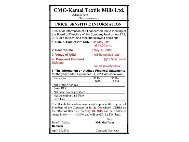Price Sensitive Information of CMC-Kamal Textile Mills Ltd.