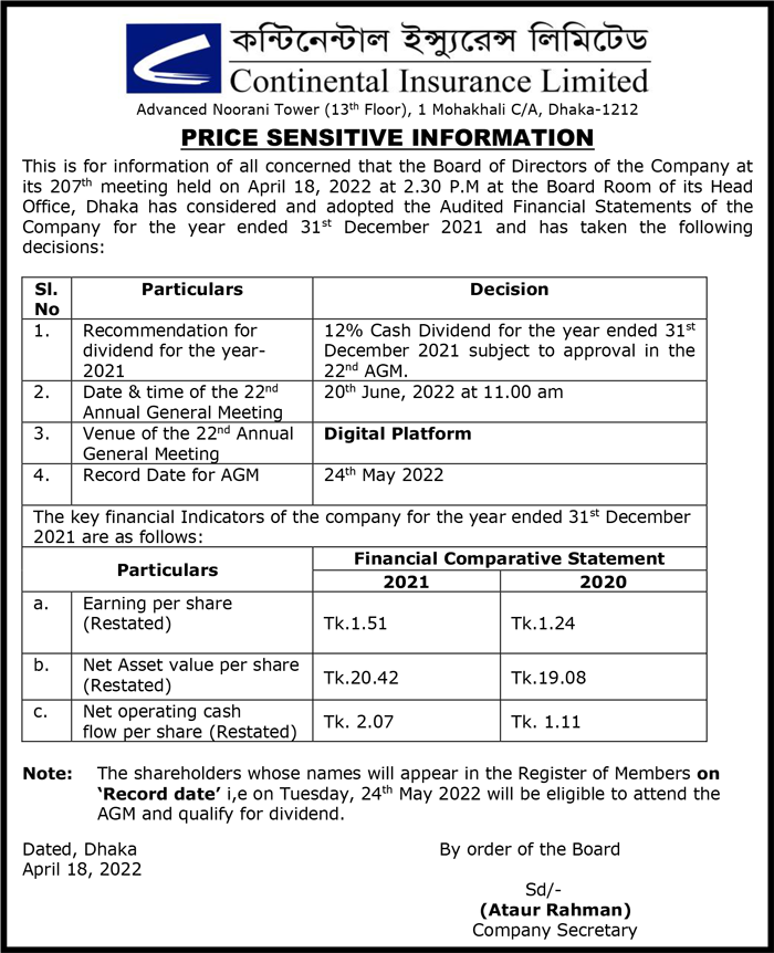 Price Sensitive Information of Continental Insurance PLC.