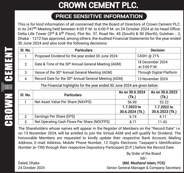 Notic to the Shareholders to claim the Uclaimed Dividend of Crown Cement PLC