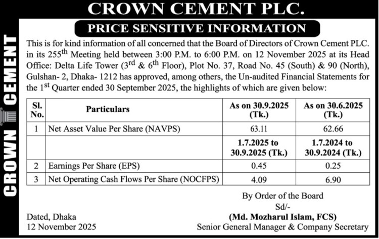Price Sensitive Information of Crown Cement PLC.