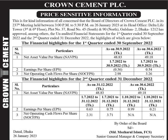 Price Sensitive Information of Credit Rating of Crown Cement PLC.