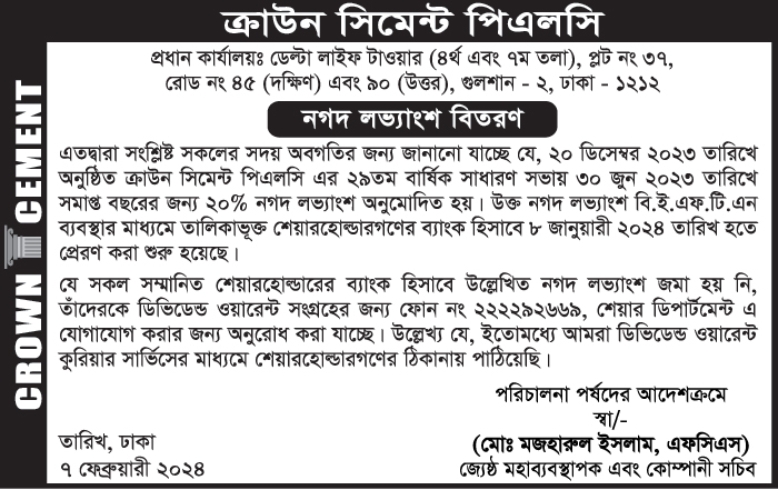 Notic to the Shareholders to claim the Uclaimed Dividend of Crown Cement PLC