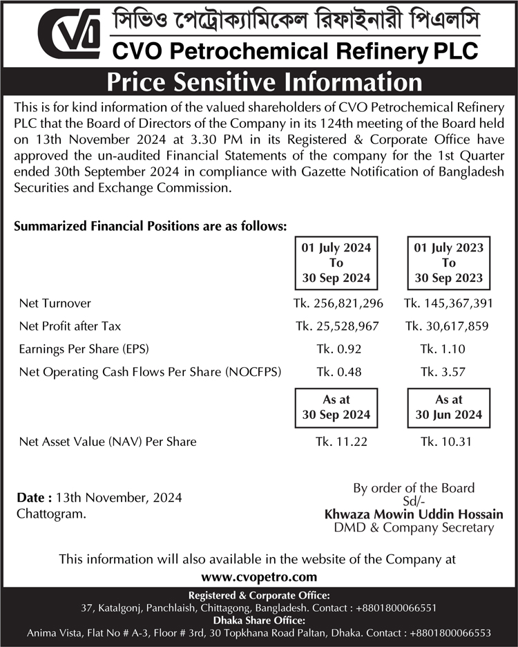 Price Sensitive Information of CVO Petrochemical Refinery PLC.