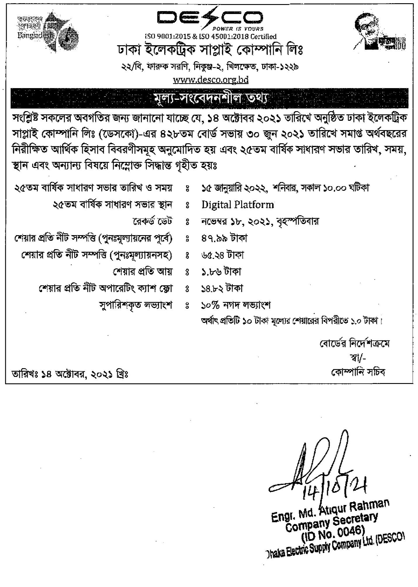 Price Sensitive Information of Dhaka Electric Supply Company Limited (DESCO)
