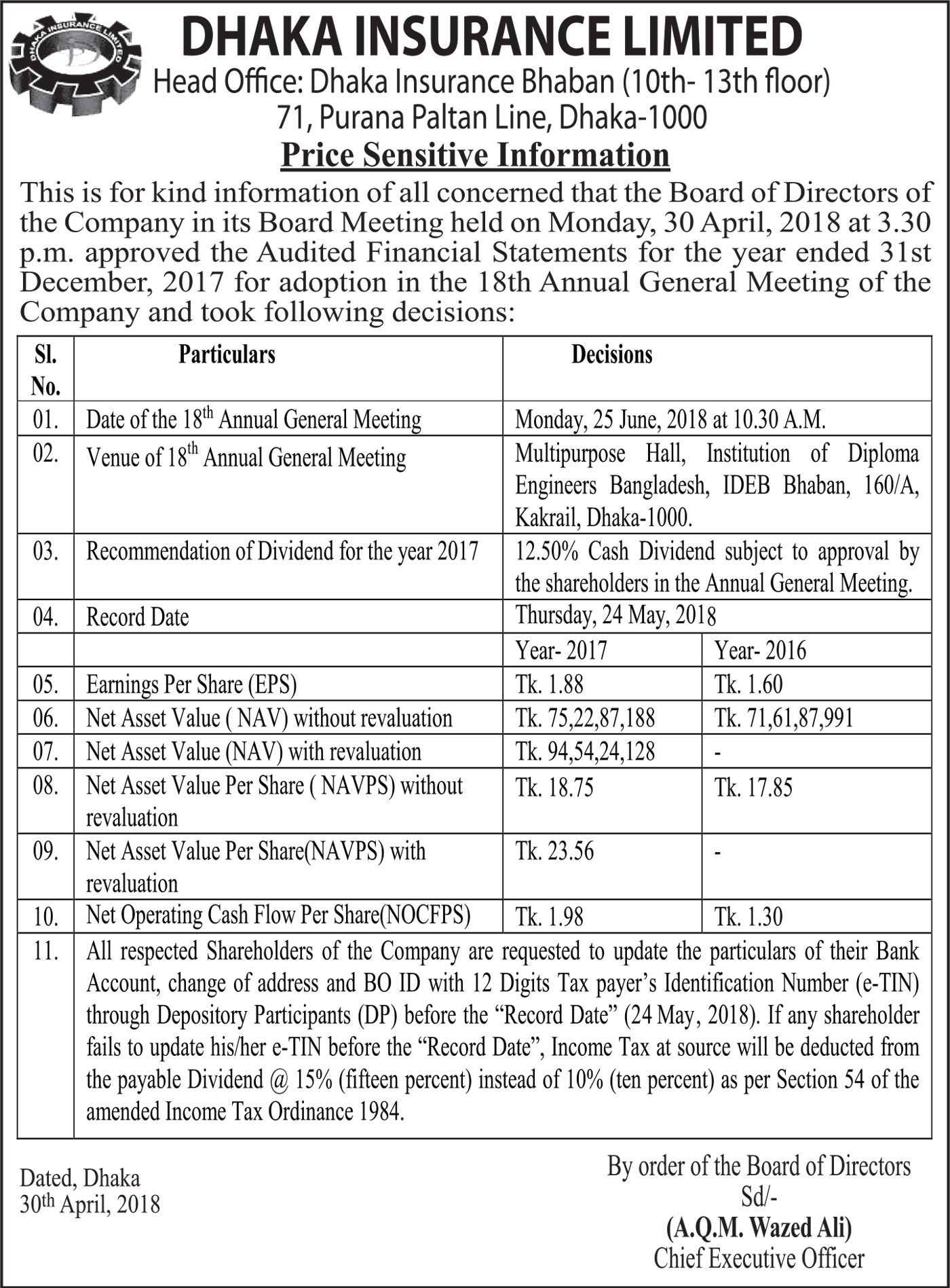 Dhaka Insurance Limited Audited Financial Statements April 2017