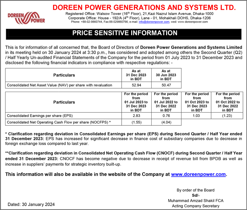 Price Sensitive Information of Doreen Power Generations and Systems Limited