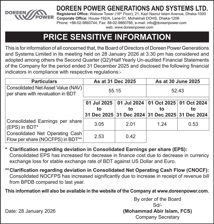 Price Sensitive Information of Doreen Power Generations and Systems Limited