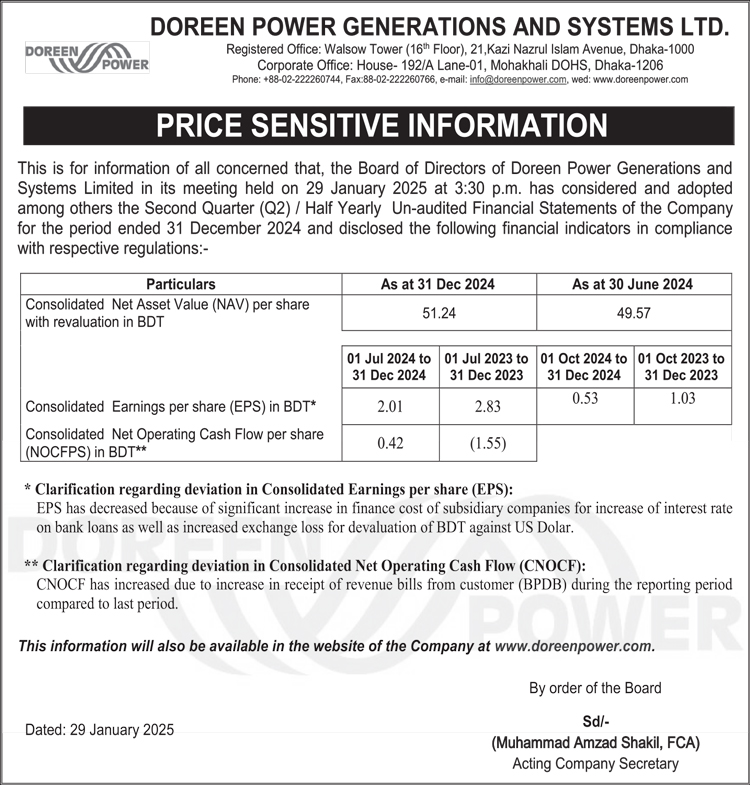Price Sensitive Information of Doreen Power Generations and Systems Limited