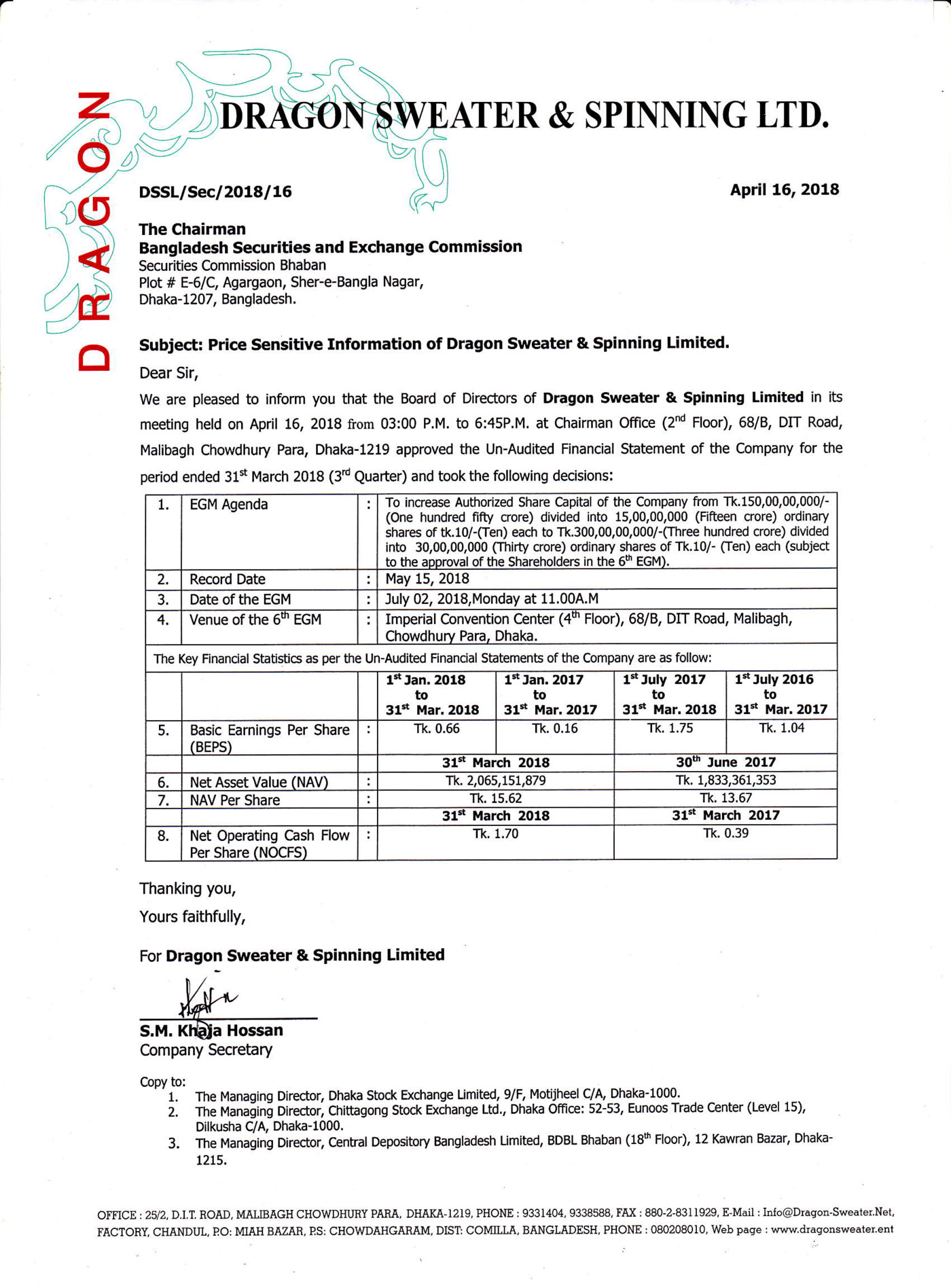 Price Sensitive Information of Dragon Sweater & Spinning Ltd.