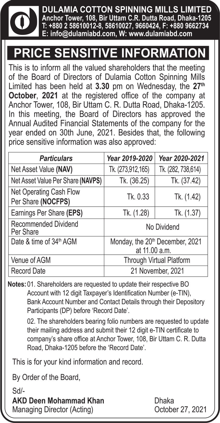 Price Sensitive Information of Dulamia Cotton Spinning Mills Ltd.