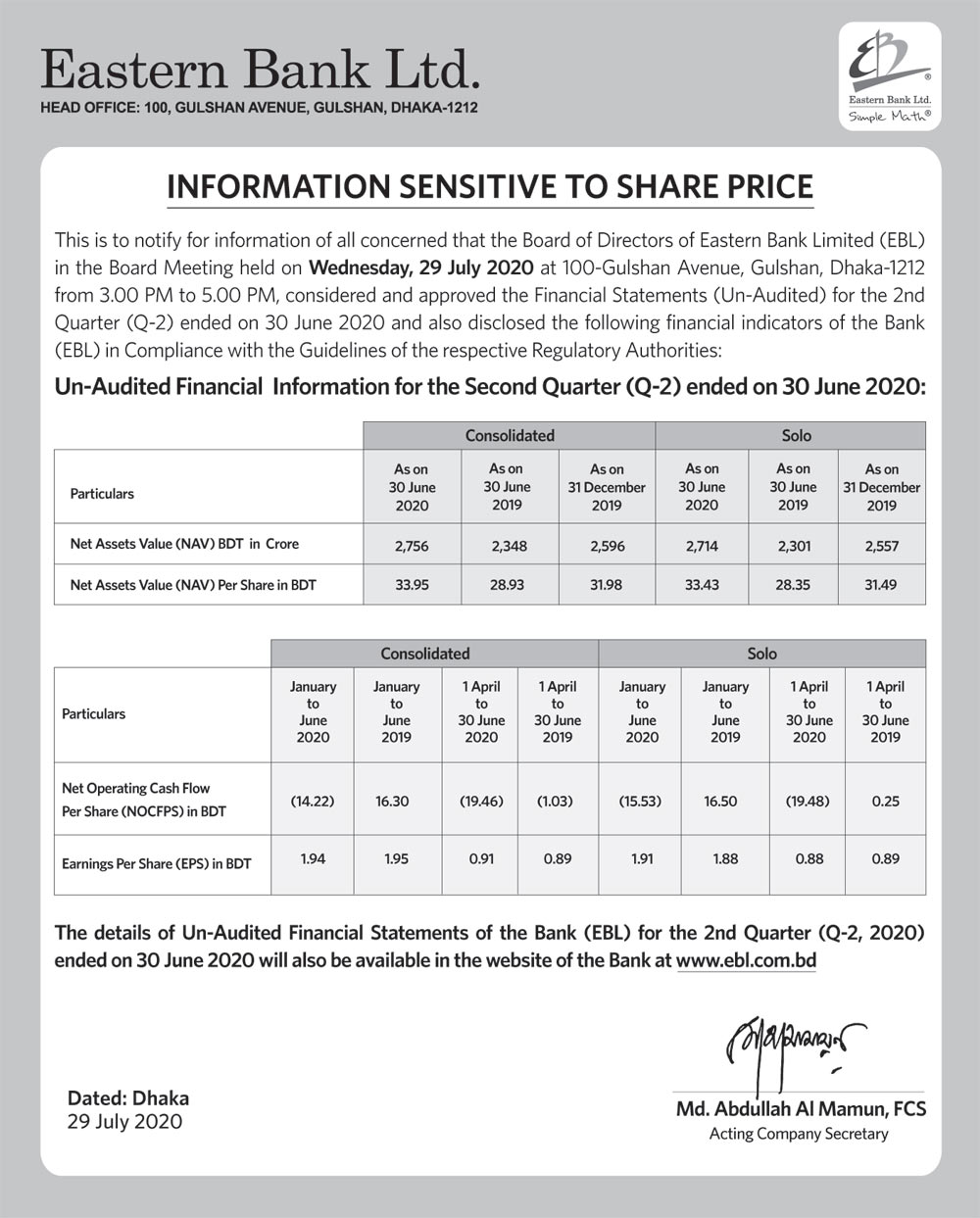 Information Sensitive to Share Price of Eastern Bank Ltd.