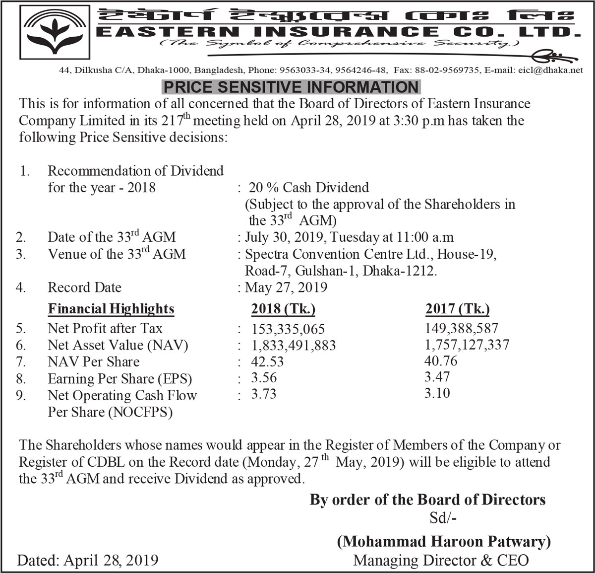 Price Sensitive Information of Eastern Insurance Co. Ltd.