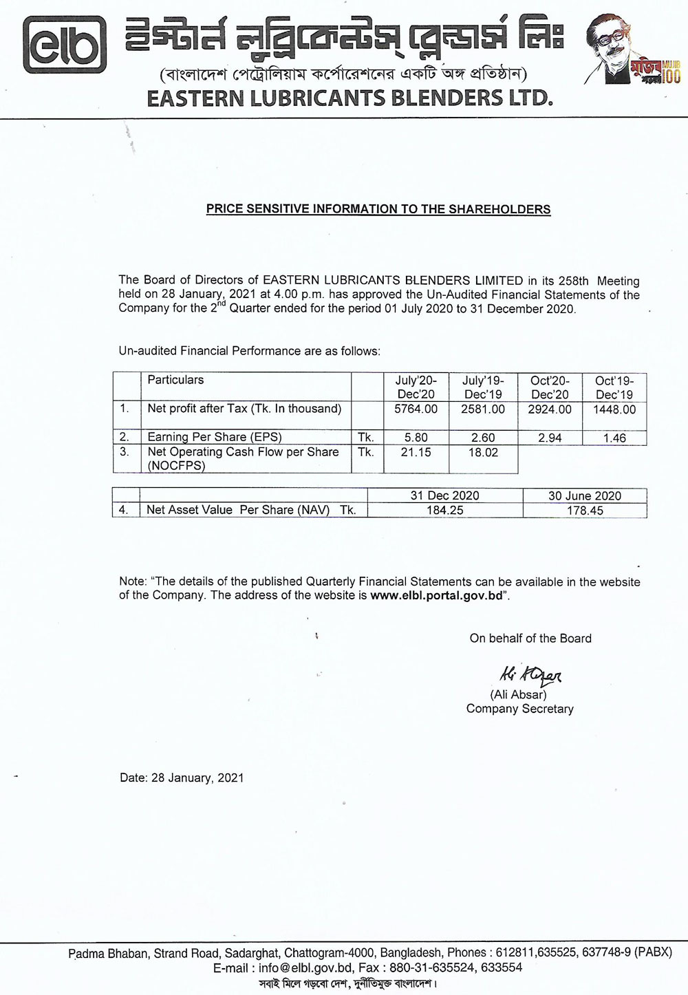 Price Sensitive Information of Eastern Lubricants Blenders Limited
