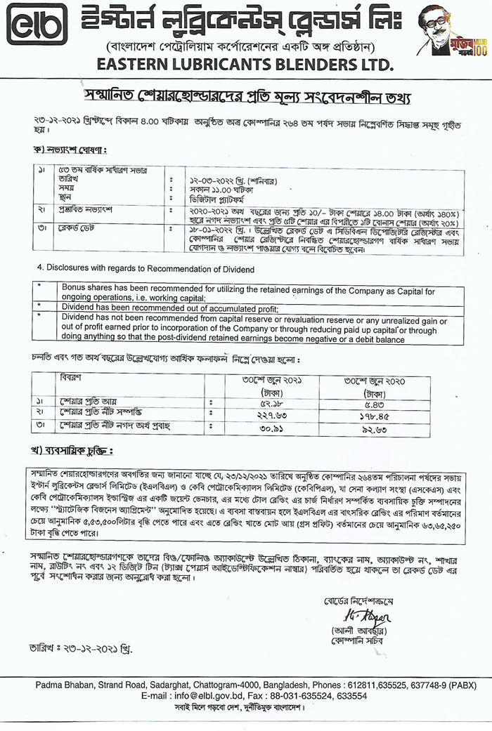 Price Sensitive Information of Eastern Lubricants Blenders Limited