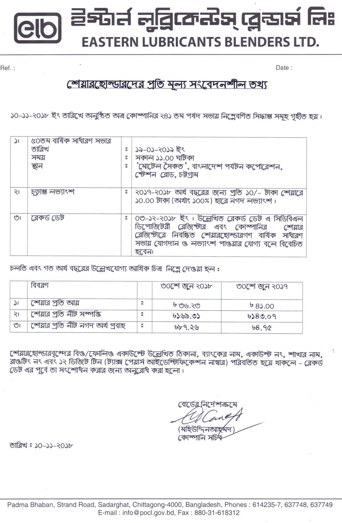 Price Sensitive Information of Eastern Lubricants Blenders Limited