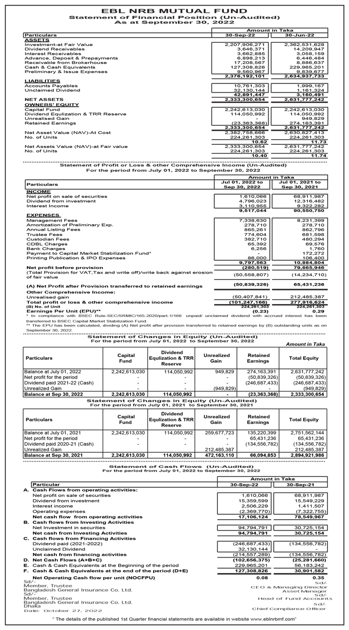 Un-audited Statements of Financial Position of EBL NRB Mutual Fund