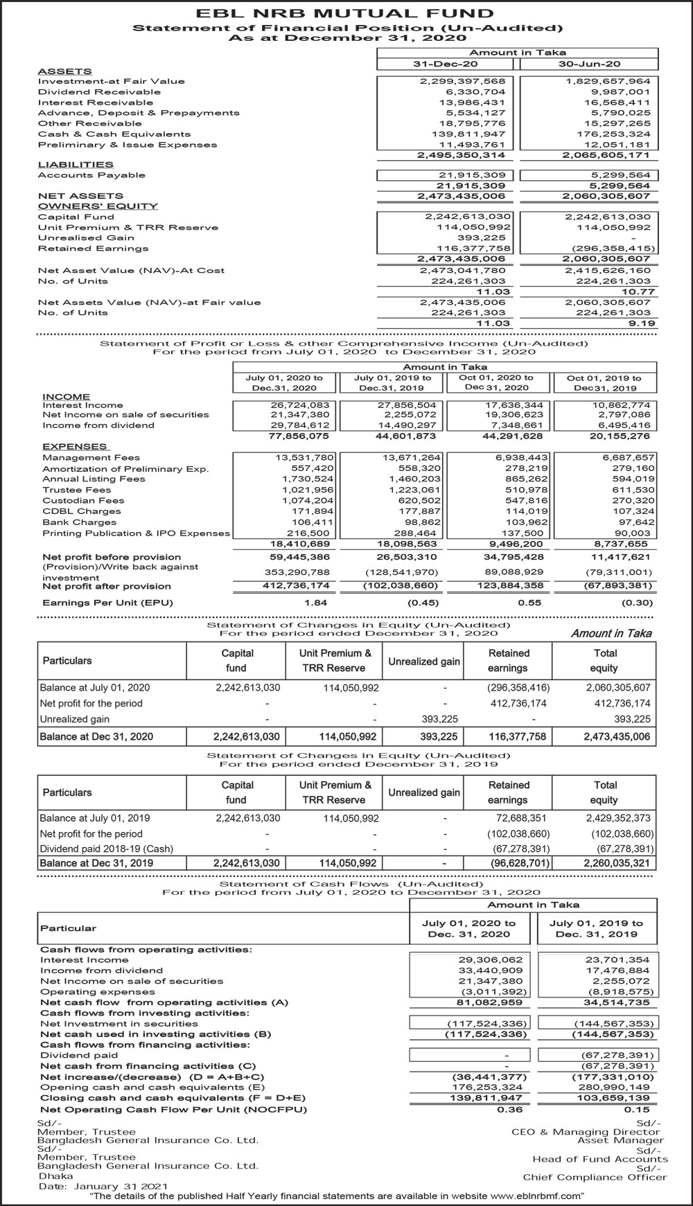 Un-audited Statements of Financial Position of EBL NRB Mutual Fund