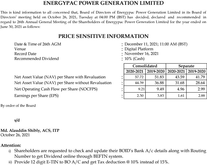 Price Sensitive Information of Energypac Power Generation Ltd.