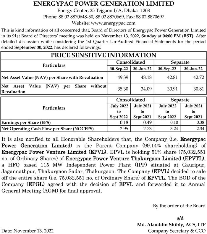 Price Sensitive Information of Energypac Power Generation PLC.