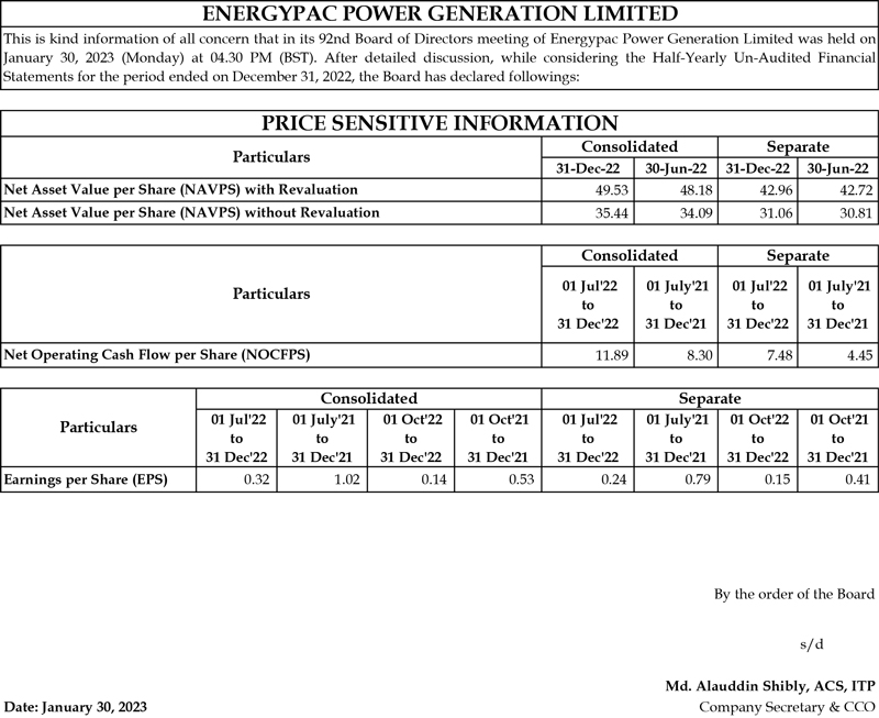 Price Sensitive Information of Energypac Power Generation PLC.