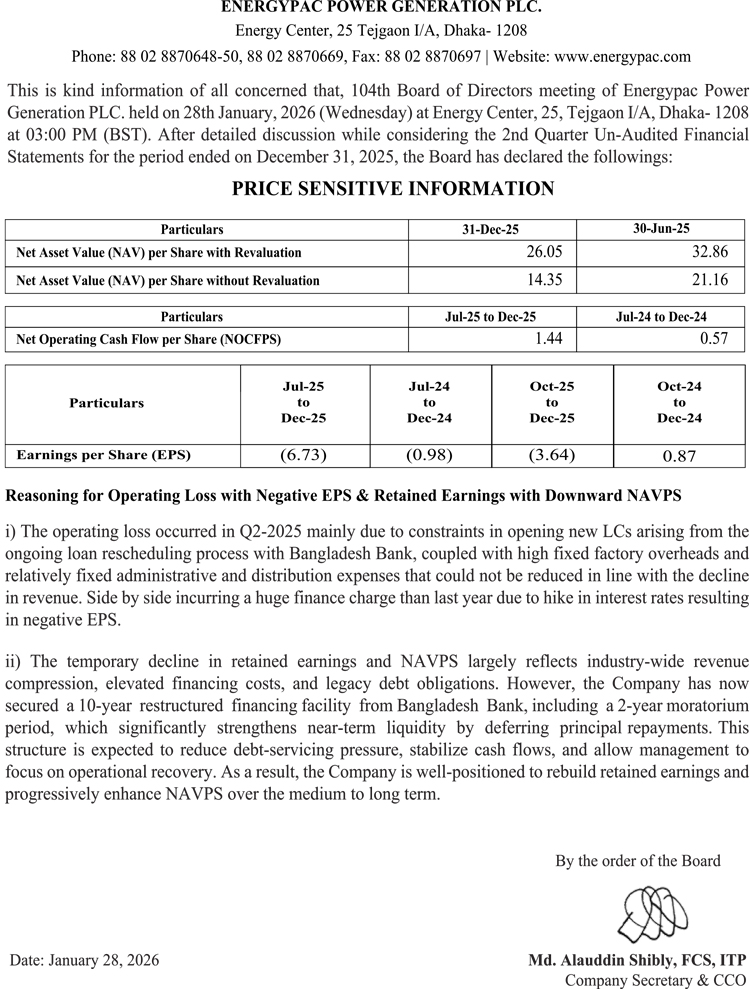 Price Sensitive Information of Energypac Power Generation PLC.